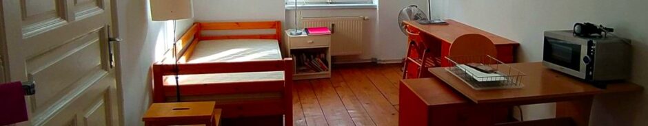 The flat has 2 rooms with 2 beds, a kitchenette and bathroom. Toilet is in the building. of course you have access to mur.at’s speedy WiFi 🙂